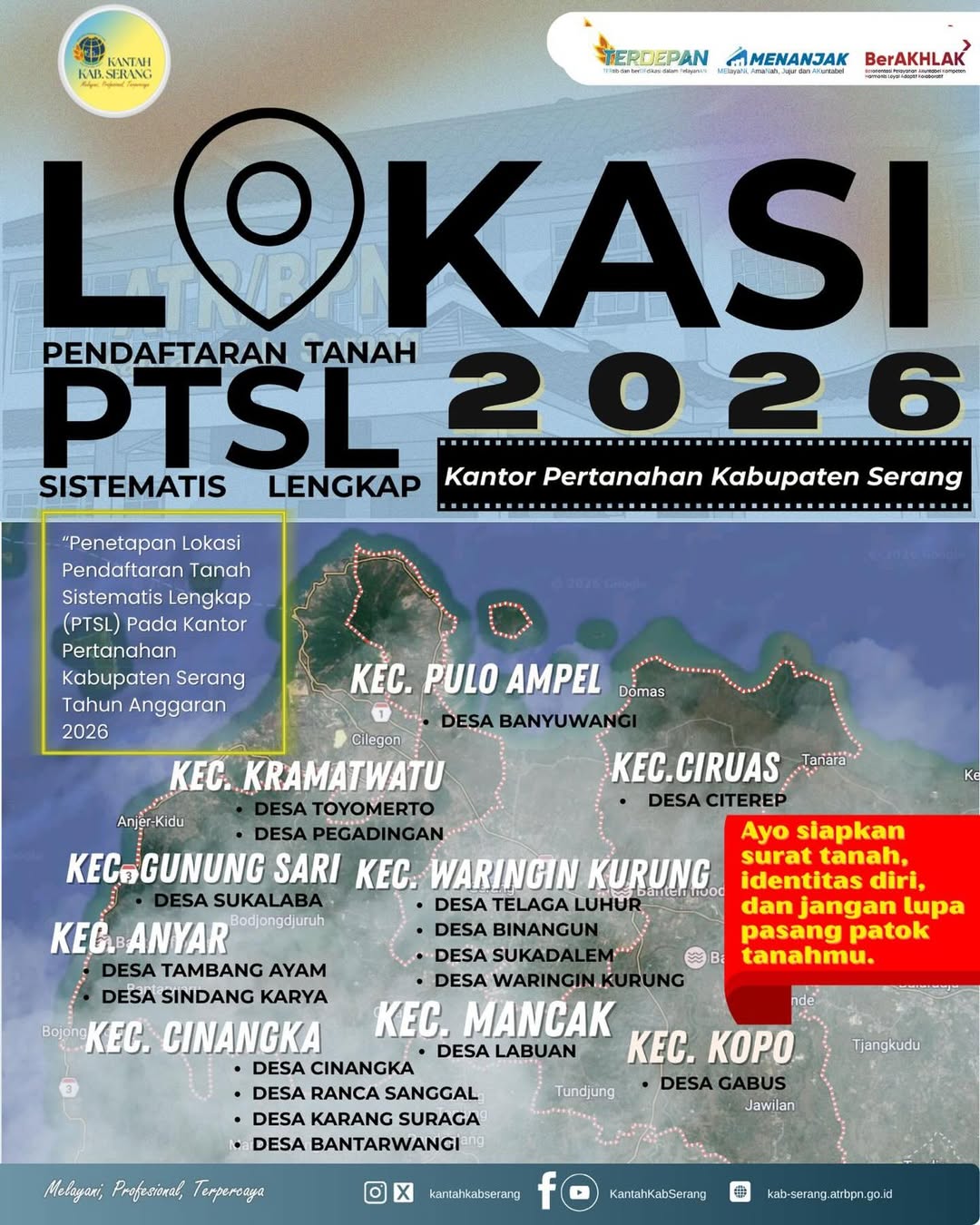 Kabar baik bagi masyarakat Kabupaten Serang! Program Pendaftaran Tanah Sistematis Lengkap (PTSL) Tahun 2026 kini resmi dibuka dengan lokasi pelaksanaan yang telah ditetapkan.